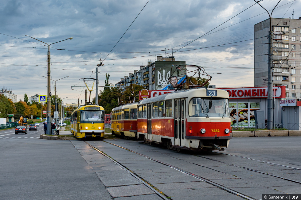 Tatra-T3SUCS #7262-7282 и Tatra-T3R.P #252-253 23-го маршрута на проспекте Тракторостроителей пересекают Юбилейный проспект