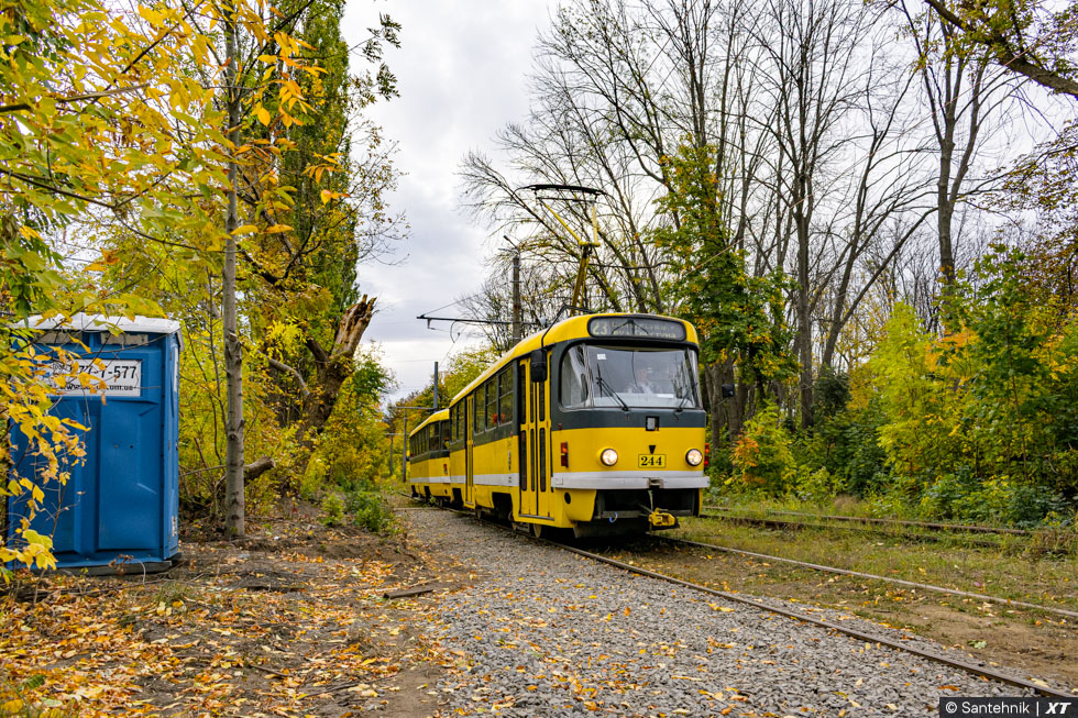 Tatra-T3R.P #244-281 23-го маршрута на проспекте Героев Харькова в тупике конечной "Улица Свистуна"