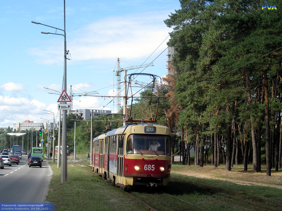 Tatra-T3SU #685-686 26-го маршрута на улице Героев труда в районе остановки "Сосновый бор"