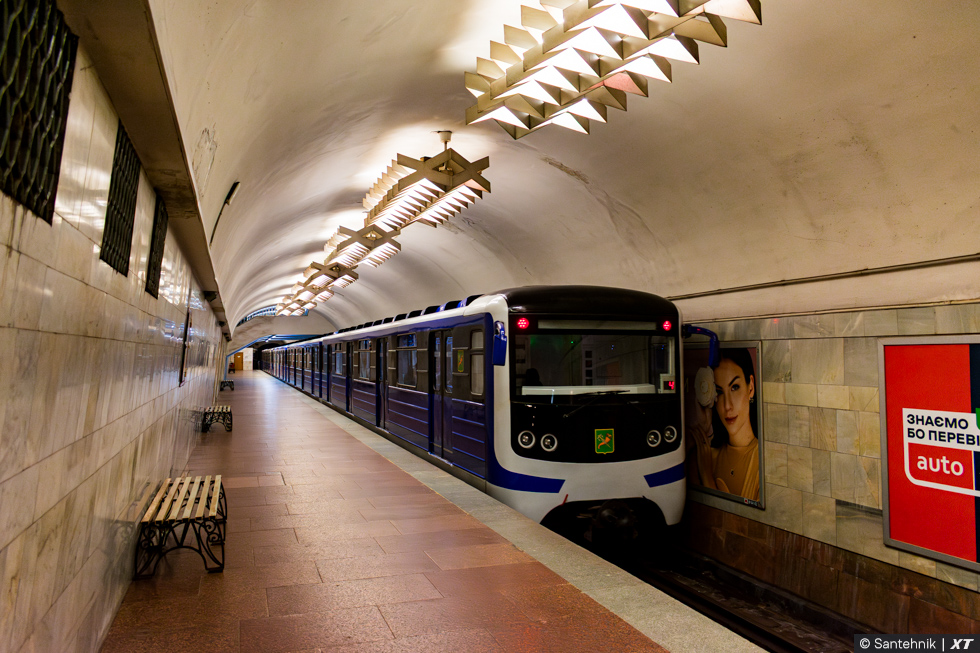 Вагон типа Еж3 #5720 в составе поезда #5917-5634-5635-5617-5720 отправляется от станции "Площадь Конституции"
