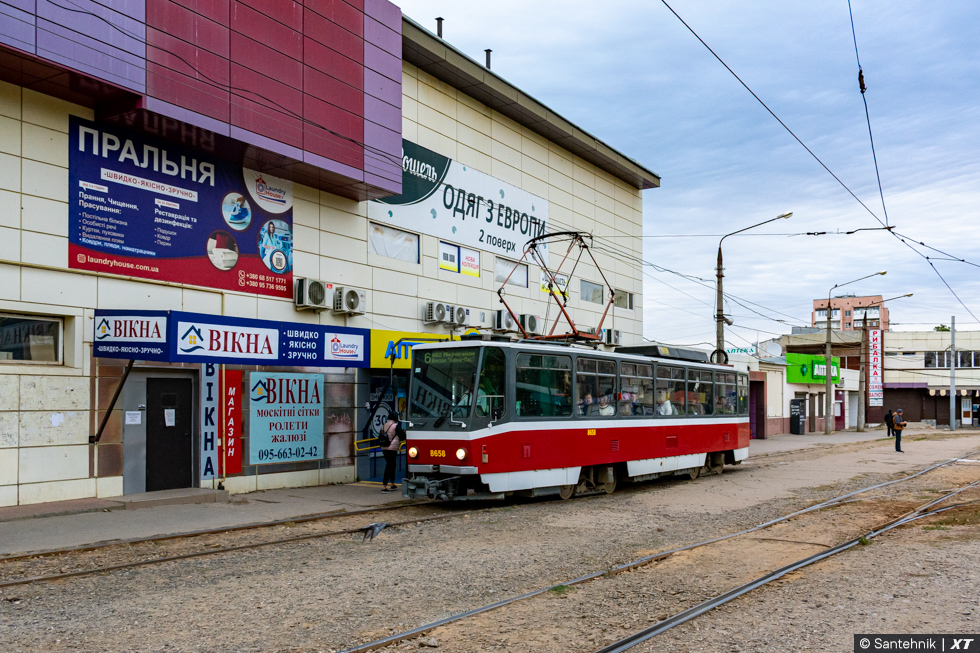 Tatra-T6A5 #8658 6-го маршрута отправляется от конечной "Микрорайон 602"
