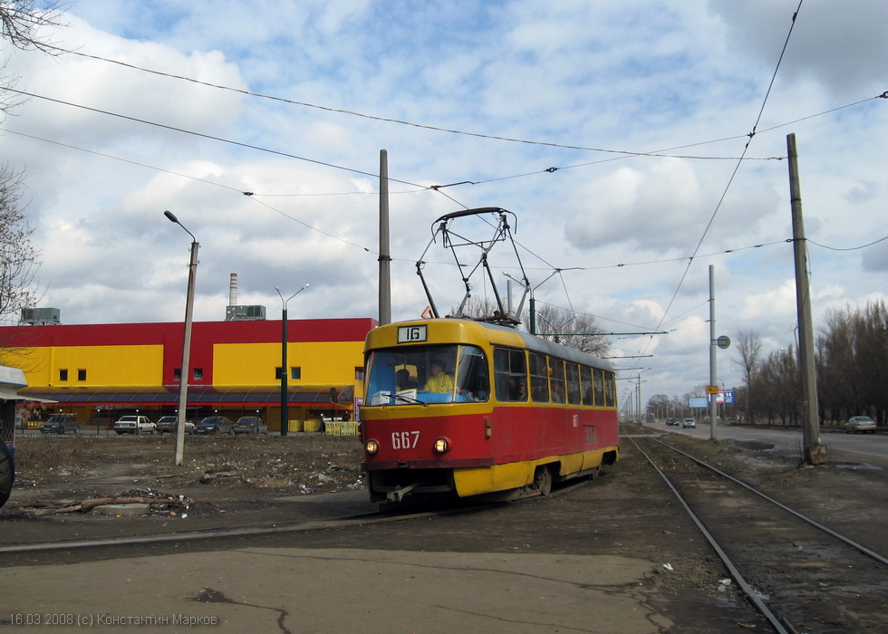 Tatra-T3SU #667 16-го маршрута на улице Шевченко возле конечной станции "Журавлевский гидропарк"