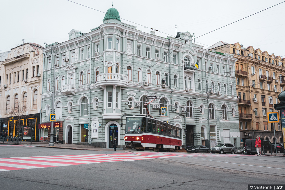 Tatra-T6A5 #8744 30-го маршрута поворачивает с проспекта Героев Харькова на площадь Конституции