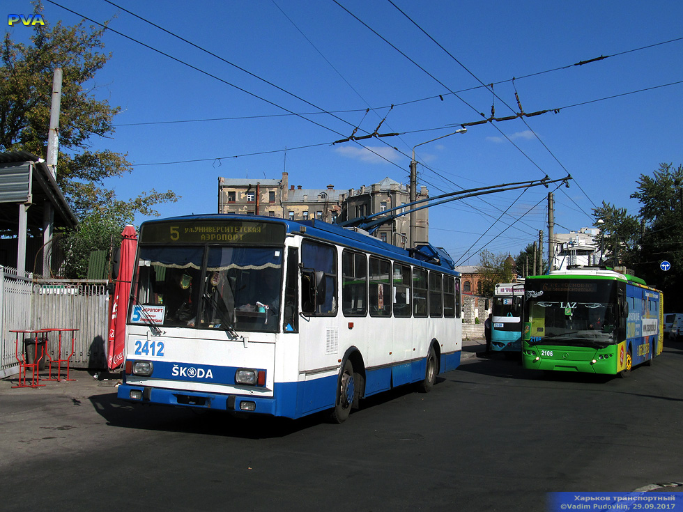 Škoda-14Tr18/6M #2412 5-го маршрута и ЛАЗ-Е183А1 #2106 6-го маршрута на конечной "Улица Университетская"