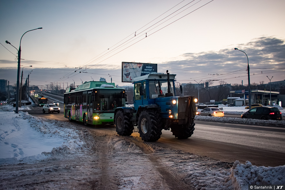 Из депо на салтовскую сеть троллейбусы попадают тоже с помощью буксира: до Коммунального путепровода идут своим ходом, а дальше, вверх к Юбилейному проспекту, их уже тянет трактор. В этот момент #3627 отправляется на подъём, а #3212 позади терпеливо ждёт своей очереди.