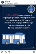 Пишут про запуск с 28.10.2025 бесплатного маршрута Станция метро "Ярослава Мудрого" - Учебный корпус НЮУ по ул. Григория Сковороды, 106 и публикуют расписание аб92 от метро "Ярослава Мудрого"
