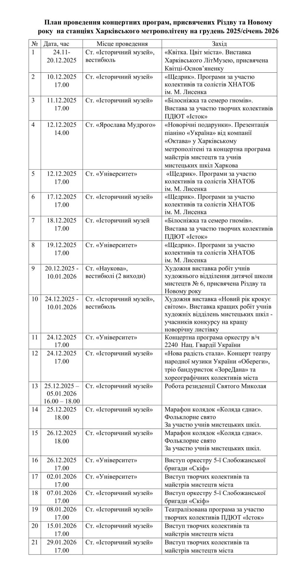З повним графіком проведення святкових заходів у метро можна ознайомитися за посиланням.