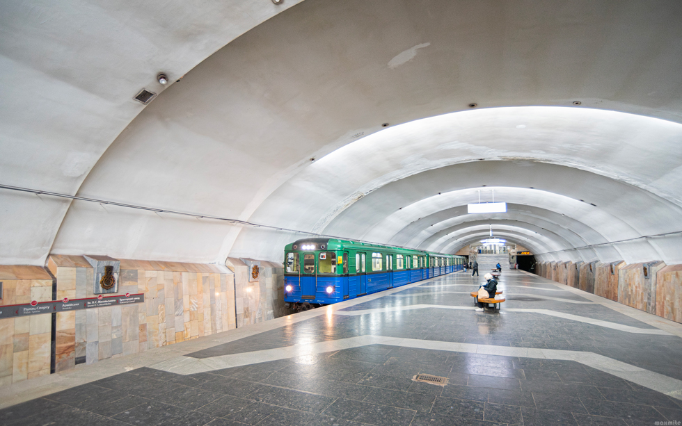 Вагон типа Еж3 #5918 в составе поезда #5918-5626-5662-5773-9044 прибывает на станцию "Тракторный завод"